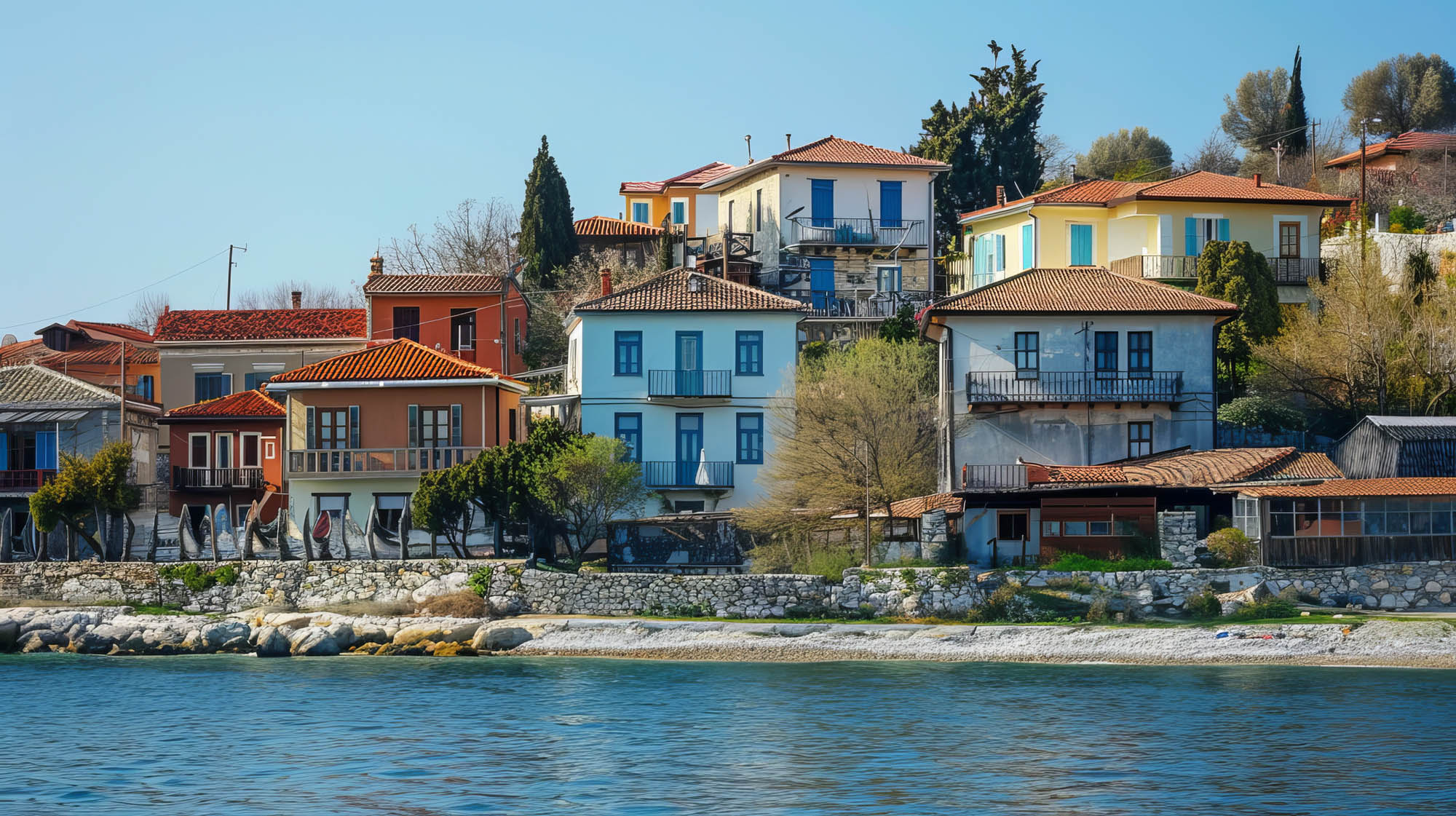 zdjęcie przedstawia morską panoramę z charakterystycznym, pocztówkowym budynkiem na chalkidiki