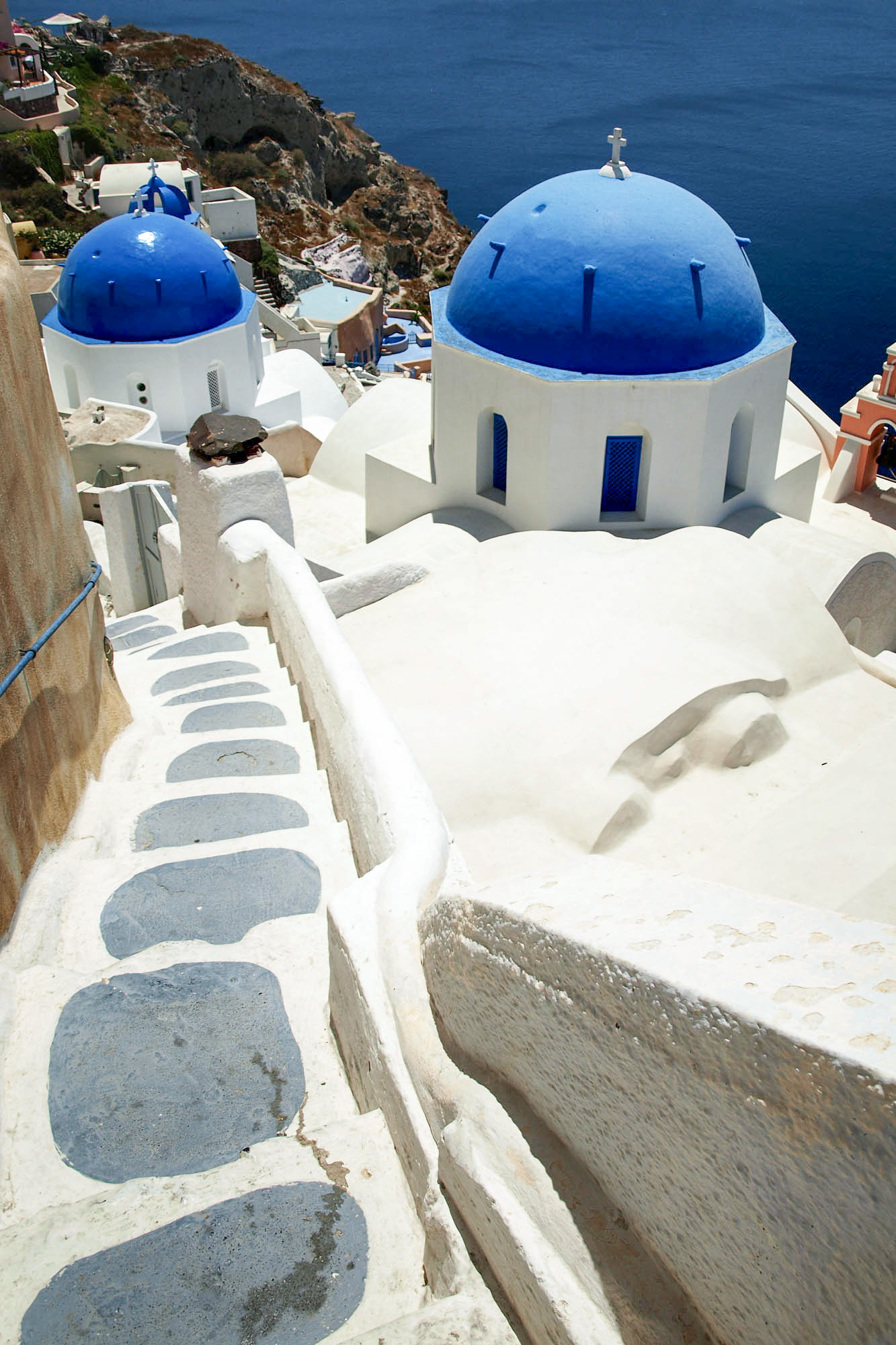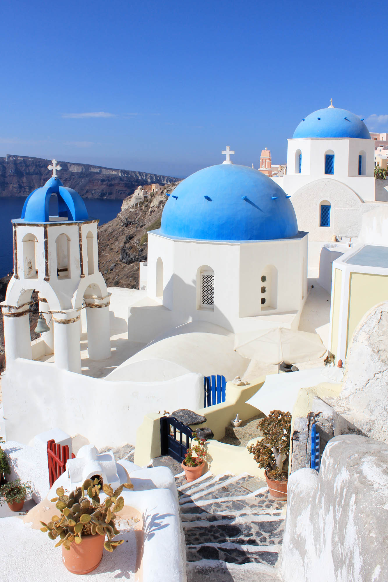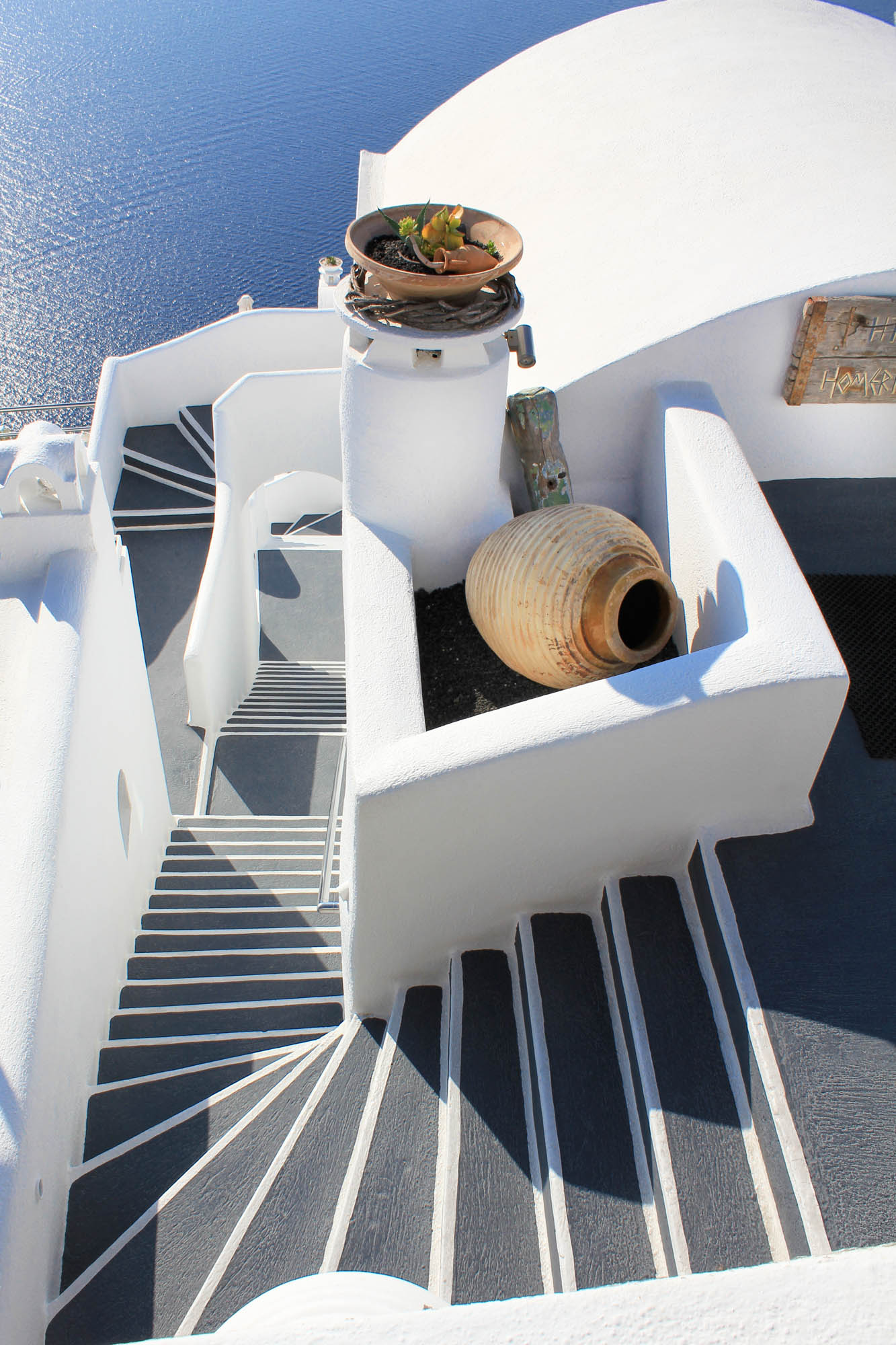 Fira to nie tylko widoki – to też labirynt wąskich, brukowanych uliczek, w których można się cudownie zgubić. Sklepy z lokalnym rękodziełem, galerie sztuki, kawiarenki z widokiem na kalderę, a wszystko to skąpane w bieli i błękicie, które są jak podpis Santorini. Spacerując, co chwila natrafiasz na urocze kapliczki, ukryte schody prowadzące w dół klifu, albo… widok, który po prostu każe ci się zatrzymać.