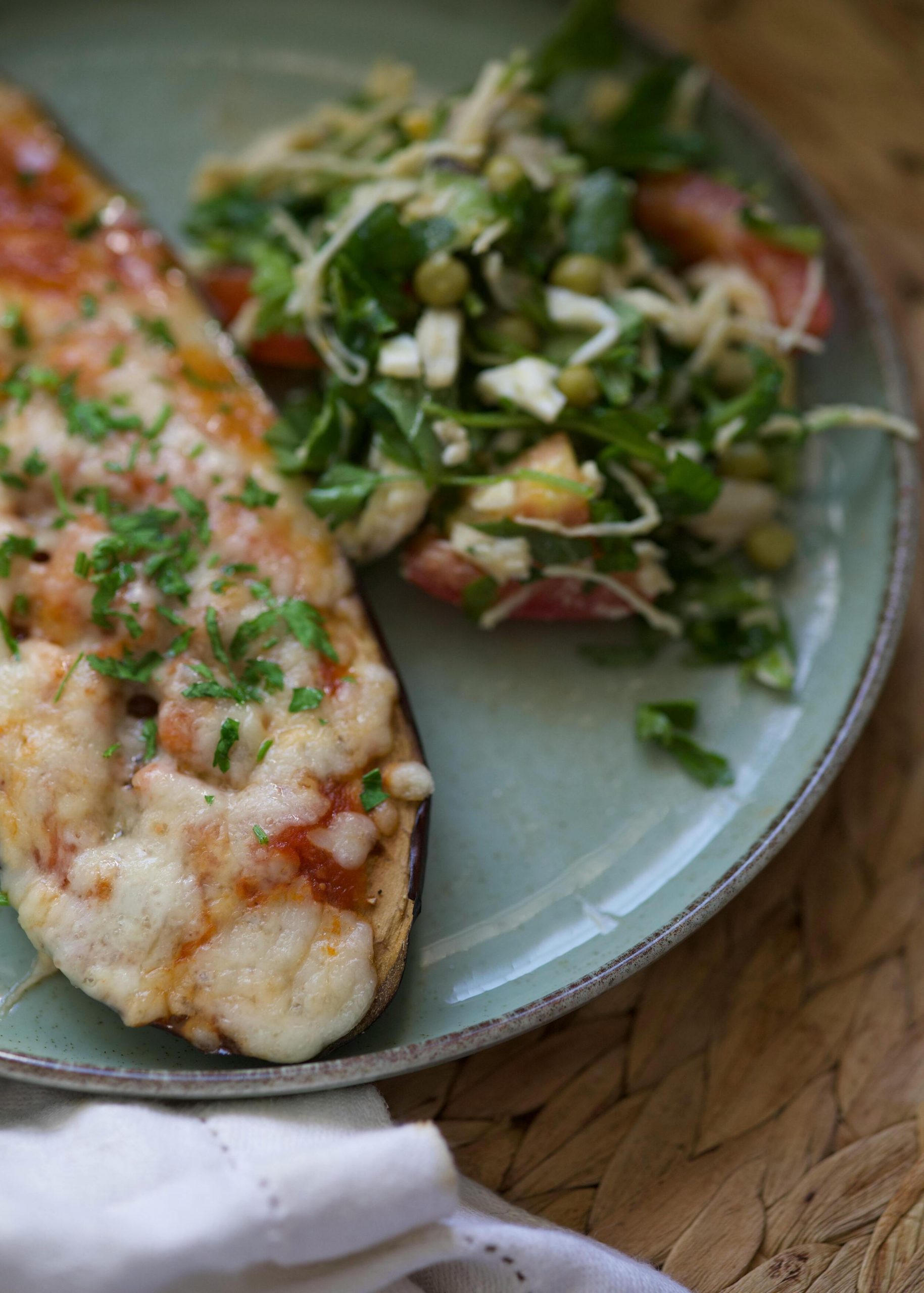Przekrój bakłażany wzdłuż na pół i delikatnie natnij miąższ. Posól i odstaw na 15 minut, aby pozbyć się goryczki. Następnie skrop oliwą i piecz w 180°C przez około 25–30 minut, aż będą miękkie. - Farsz