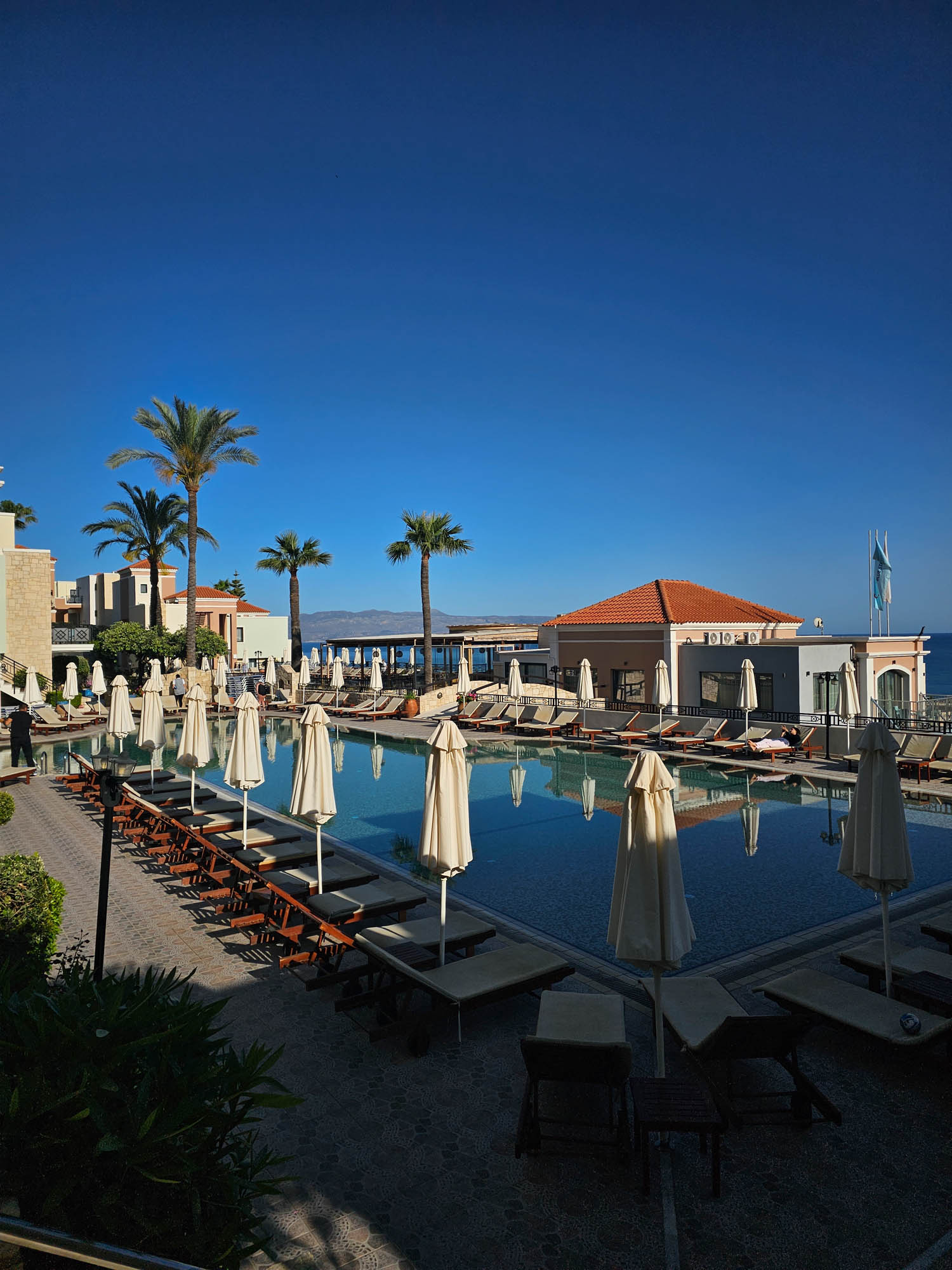 Choć planując wyjazd na Kretę w połowie maja martwiliśmy się o pogodę, Grecja przywitała nas słońcem i idealną temperaturą – ani za gorąco, ani za chłodno, po prostu perfekcyjnie. Zatrzymaliśmy się w hotelu Caldera Village w Ag. Marina, z którego rozciągał się piękny widok na morze, a do tawern i plaży mieliśmy zaledwie kilka kroków. Idealne miejsce na leniwe poranki i romantyczne zachody słońca.